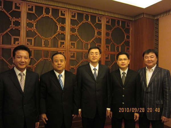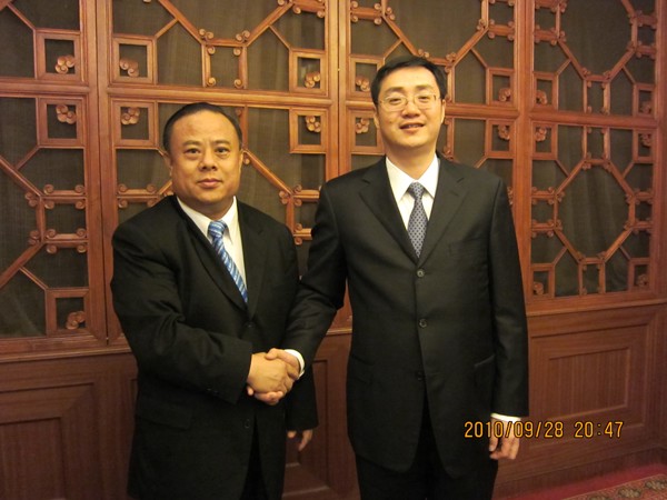 2010年9月28日,中国共青团中央书记处常务书记、中华全国青年联合会主席王晓阁下于北京首都大酒店亲切地会见并宴请泰国华人青年商会会长李桂雄、顾问陈灿标、顾问赵春森、副会长周德奋。图(一)王晓主席(右)接见李桂雄会长(左)时影。