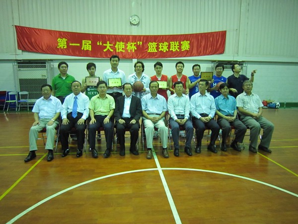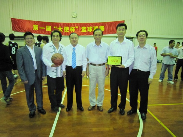 由中国大使馆主办的、本会为支持单位的第一届"大使杯"篮球联赛,经过一个多月的友谊比赛,赛出了友谊、赛出了技术,2010年10月15日在中国大使馆篮球馆闭幕了。本会会长李桂雄、执行会长张扬、副会长李荣、会长助理尚延明、秘书长时磊等参加了闭幕式,李会长向优秀球员颁发了奖章。