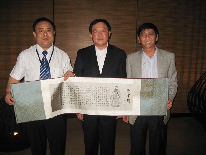 2010年12月1日湖北人民对外友好协会会长邵元洲应邀参加泰国中华总商会一百周年庆典系列活动,拜访了泰国华人青年商会会长李桂雄并与李会长作亲切会谈。图为邵元洲会长(右)赠送纪念品予李桂雄会长(左),(中)为大使馆高振廷参赞。