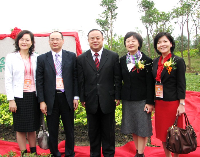 (三)国际潮青联合会副理事长、第五届国际潮青联谊年会主席、泰国华人青年商会会长李桂雄(中)植树仪式后与共青团汕头市委书记周崇凝(右二)、共青团潮州市委书记王晓霞(左一)、共青团揭阳市委书记江水(左二)、共青团汕尾市委书记曾晓佳(右一),植树仪式后合影。