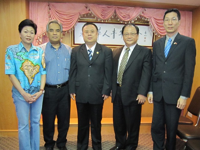 2011年1月17日,将于2月1日上任泰国国际航空(大众)有限公司驻中国总经理孟仕鹏(Siriphong Mangkalee)暨夫人访问泰国华人青年商会,受到李会长的亲切接见和热烈欢迎,并与李会长、邝锦荣副会长、泰国大亚旅运社有限公司董事总经理杨明等进行广泛的交流和座谈。图为:李桂雄会长(中)、邝锦荣副会长(右)与孟仕鹏总经理(左二)、孟夫人(左)、杨明总经理(右二)合影。