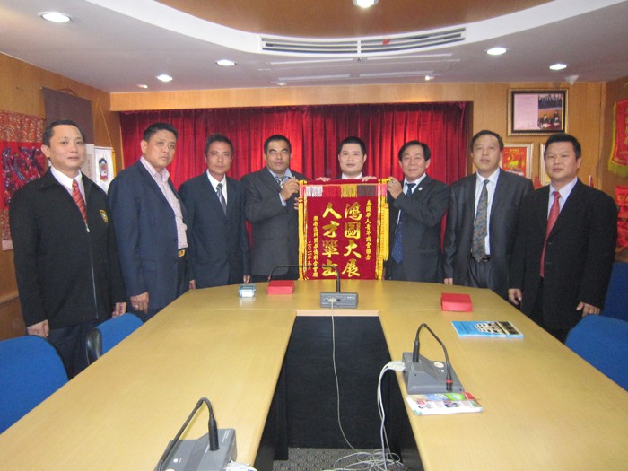 2011年2月20日,汕头市潮南区华侨联合会主席荘楚光、秘书长张群雄等抵本会访问。本会副会长张创标,会长助理郑丁禹,主任周锡铭、许俊龙、陈鹏等欢迎接待了家乡的领导,并做亲切会谈。荘楚光主席表示今后将继续加强合作,互通信息,做好海内外侨胞、侨眷工作,为海外华侨服务。图为宾主互赠纪念品。