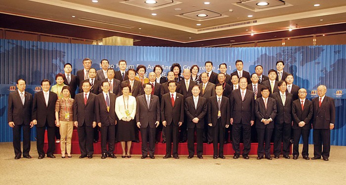 图一:四月十五日中国国家主席胡锦涛出席博鳌亚洲论坛二○一一年会,会见来自世界各地出席会议的侨商代表并合影。前排(左一)泰国中华总商会主席吴宏丰博士。(左七)中国侨商投资企业协会会长谢国民博士。中排(第七)泰国潮州会馆主席陈汉士博士。后排(右二)泰国华人青年商会会长李桂雄。