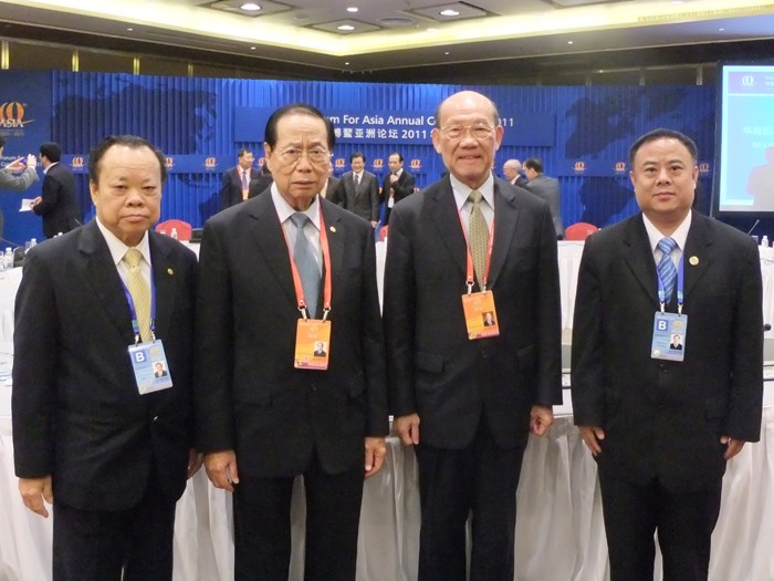 图五:泰国中华总商会主席吴宏丰博士(左二)、泰国潮州会馆主席陈汉士博士(右二)、泰国中华总商会副主席刘暹有先生(左一)与泰国华人青年商会李桂雄会长(右二)在博鳌亚洲论坛二○一一年会上合影。