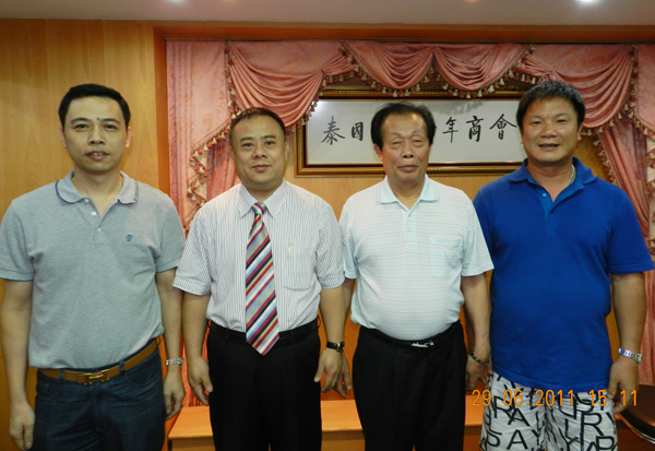 二 0 一 一年六月二十九日,中国著名山水画家、广东省文史馆馆员马流洲先生抵泰国华人青年商会访问并作艺术文化交流,受到该会会长李桂雄、顾问马伟鹏、会长助理王少青欢迎和接待。图为李桂雄会长(左二)、马流洲画家(右二)、马伟鹏顾问(右一)、王少青会长助理(左一)在会客室合影。