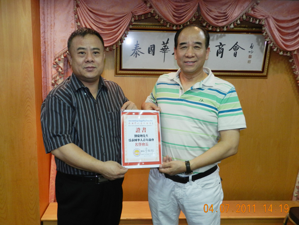 2011年7月4日,中国圣康集团总裁刘庆增先生抵本会访问,受到会长李桂雄的亲切接待。刘庆增先生为中国著名企业家,事业有成,为祖国经济建设做出成就。李会长特聘请刘先生为本会名誉会长,并颁发证书予刘庆增先生。