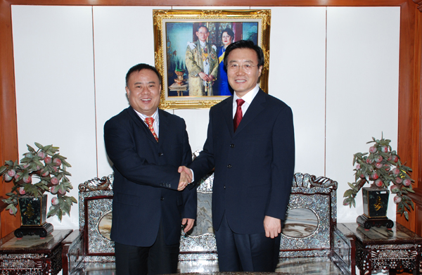 2011年7月12日,本会会长李桂雄于中华总商会热烈欢迎北京市委常委、市委秘书长李士祥率领的北京市人民政府访泰代表团,并进行了交流座谈。图为李桂雄会长欢迎李士祥秘书长时握手言欢。