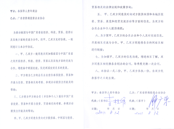 中国广东省侨商会代表团一行十七位,由常务副会长钟广荣率领,于2011年8月12日上午莅临泰国华人青年商会参访,受到李桂雄会长偕常务副会长林嘉南,副会长罗欣迎、钟和武,会长助理王少青,财务主任欧阳建生,主任许俊龙,副秘书长文杰、林启扬,常委陈玉宝及总干事黄成等热情欢迎接待,宾主亲切座谈,签署合作协议书。