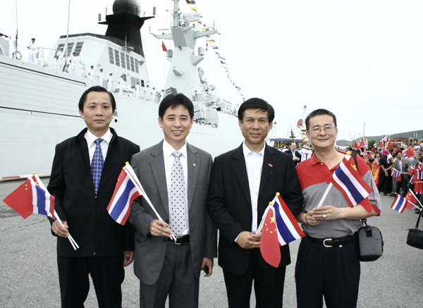 2011年8月16日上午8时,本会副会长林兆祥、名誉会长蔡荣庄、主任许俊龙、副秘书长徐位江、执委张柱、总干事黄成,随泰国中华总商会暨泰华各界人士,前往泰国海军梭桃邑基地码头,热烈欢迎中国南海护航编队“温州号”、“马鞍山号”导弹护卫舰和“千岛湖号”综合补给舰总指挥韩小虎大校、政委周校进大校及全体官兵九百多人应邀莅泰进行友好访问,气氛热烈,场面盛大温馨感人。