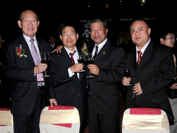 泰国副总理差廉•如挽仑警上尉(右二)、潮州会馆主席陈汉士博士(左一)、广东省人民政府秘书长唐豪先生(左二)与李桂雄会长在大会上合影
