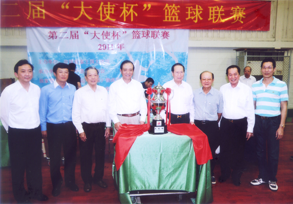 第二届“大使杯”篮球赛于二 0 一 一年九月十六日下午三时在中国大使馆篮球场隆重开幕,本会副会长邝锦荣出席开幕仪式。图为邝锦荣副会长(右一)与管木大使等首长合影。