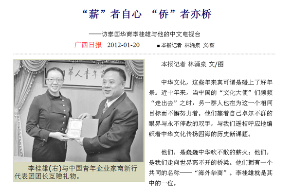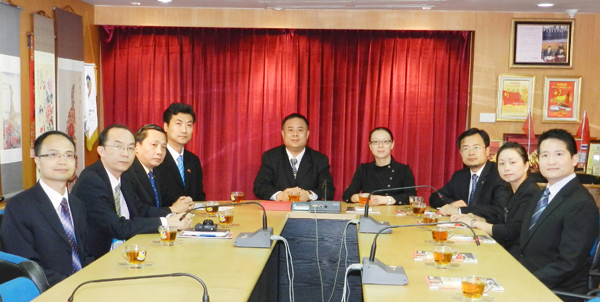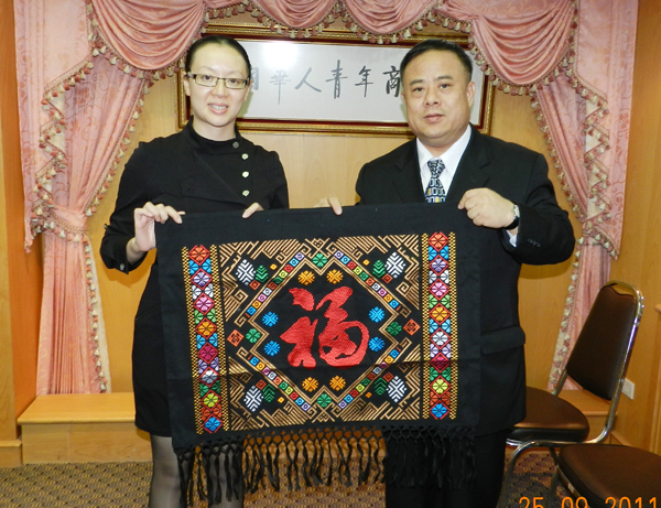 中国青年企业家南新走廊行代表团团长严霜(中国东盟—青年企业家协会副会长、广西青年企业家协会会长、广西青年联合会副主席)率领副团长陈博智(中腾燃气集团有限公司副主席),成员刘俊林(北京科鼎隆科技发展有限公司总经理)、凌峰(广西南宁越中会展商务有限公司总经理)、杨健豪(广西青年企业家协会常务副会长兼秘书长)、毛艳(广西社会科学院研究员)、李 斌(新华社广西分社经济部记者)、蒋雪林(中国新闻社广西分社新闻中心主任)、欧曼(翻译)一行,于2011年9月25日(星期日)下午莅临泰国华人青年商会访问。抵达时,受到泰华青商会李桂雄会长偕时磊秘书长,许俊龙主任的热情迎接,宾主亲切并互赠纪念,气氛融洽愉快。
