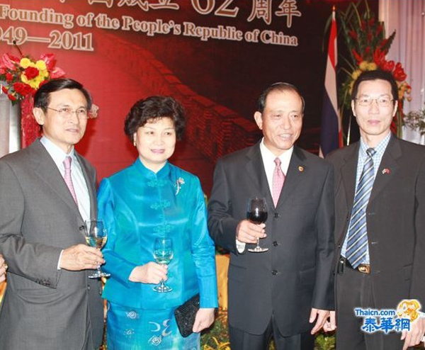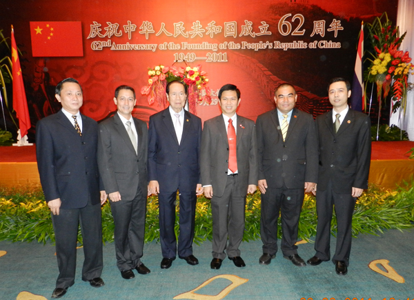二 0 一 一年九月二十九晚,中华人民共和国驻泰王国大使馆假曼谷香格里拉大酒店举行盛大庆祝酒会,庆祝中华人民共和国成立六十二周年。泰中长官、各友好国家使节、泰华侨社首长等二千多人参加。泰国华人青年商会出席当晚酒会的有:副会长邝锦荣、张创标、会长助理胡坚毅、王少青、尚延明,主任周锡明、许俊龙、武风,秘书长时磊,副秘书长文杰等。