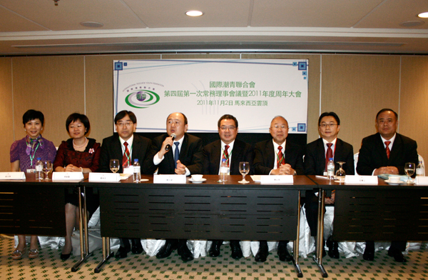 2011年11月2日,在马来西亚云顶会议中心举行的“国际潮青联合会第四届第一次常务理事会2011年度大会”,出席会议的各国、地区理事代表一百多位,通过了多项重要会务决议。图为理事会首长在主席台上(左至右)林秘书长、周崇凝副理事长、高永文永远会长、陈文雄理事长、陈幼南会长、庄学山永远会长、许典雄永远会长、李桂雄副理事长。