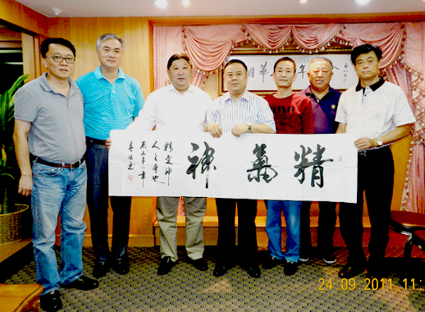 2011年9月24日,泰国华人青年商会海外顾问、江苏代表处主任、江苏华远澳玛重工有限公司董事长王益新(右三)率团抵达泰国华人青年商会访问,受到李桂雄会长(中)、执委周艺航(左一)等欢迎接待。王益新董事长等赠送著名书法家吴春暖大师“精气神”墨宝予李会长留念,该访问团的还有:于健先生、张瀛先生、戈升涛先生、刘崇健先生等。