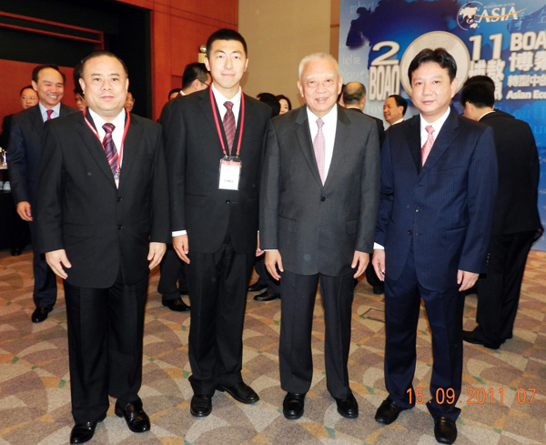 2011年9月15日由泰国华人青年商会协办的在香港举行的博鳌青年论坛上,李桂雄会长(左一),赵春森教授(右一)与全国政协副主席董建华(右二),全国青联副主席齐兴达(左二)合影