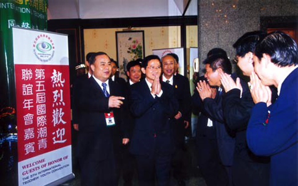 2008年3月18日第五届国际潮青联谊年会假曼谷举行,大会主席李桂雄(左一)欢迎泰国国务院总理颂猜(左二)阁下莅临会场