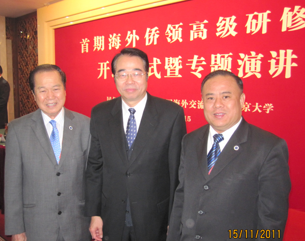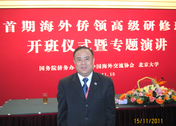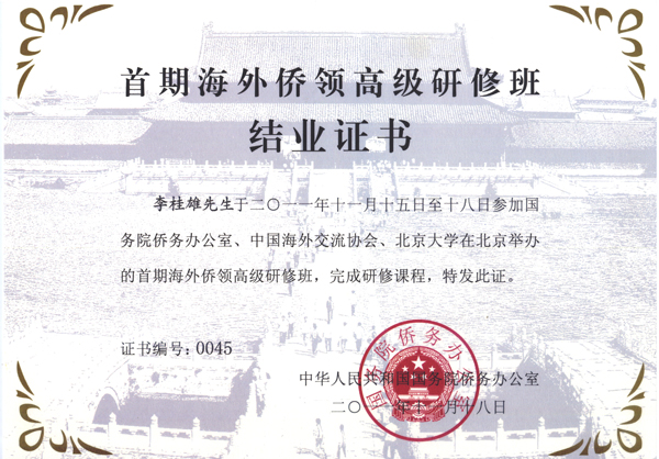 2011年11月13日至19日,本会会长李桂雄应邀赴北京参加了由中国国务院侨务办公室、中国海外交流协会联合北京大学举办的“首期海外侨领高级研修班”。此次研修班51位学员是来自美国、加拿大、澳大利亚、日本、马来西亚、泰国、菲律宾等28个国家和地区的主要华侨华人社团首长。研修学习为期4天,分课堂讲授和实地考察两个阶段。研修的专题有:“中国侨务政策与实践”,主讲:许又声(国侨办副主任);“中国经济发展方式转变与外商投资政策”,主讲:武常岐(北京大学光华管理学院战略管理系教授);“领导科学和社团管理”,主讲:李成言(北京大学政府管理学院教授);“中国民族政策”,主讲:吴仕民(国家民委副主任);“中国对台政策”,主讲:孙亚夫(国务院台办主任);“中国宗教政策”,主讲:蒋永坚(国家宗教局副局长);“中国外交战略”,主讲:刘友法(中国国际问题研究所副所长);“中国传统文化的现代价值”,主讲:程郁缀(北京大学中文教授)。